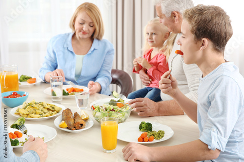 Happy family having lunch in kitchen