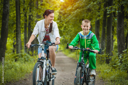 Happy family. mother and son riding bicycle in the park