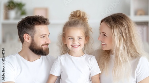 Happy family portrait. A loving father, mother, and daughter are smiling and looking at each other