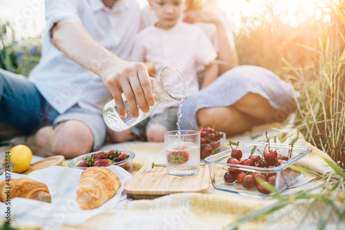 Happy family spending time together outside in nature on vacation outdoors. Mom, dad and son having picnic on weat field at countryside. The concept of family holiday.