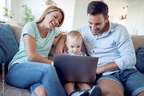 family, man, woman, father, mother, boy, eltern, children, son, sitting, sofa, resting, living room, togetherness, laptop, cartoon, beautiful, happy, mother, 30s, casual attire, caucasian, positivity, fun, little, cute, people, husband, room, joy, home, looking, happiness, smile, couch, interior