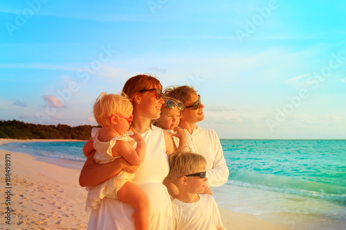 happy family with three kids on tropical beach