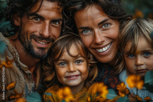 Happy family with two children posing amongst sunflowers, the parents lovingly looking at their kids
