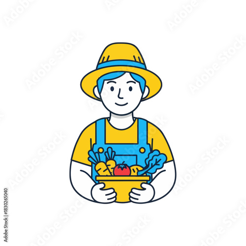 farmer, gardener, vegetable, produce, basket, harvest, agriculture, food, tomatoes, carrot, lettuce, hat, overall, men at work, grow, cultivate, farm, happy, friendly, smiling, colourful, vibrant, fresh, healthy, organic, simple, clean, line, flat, cartoon, graphic, illustration, vector, isolated, white background, icon, symbol, design element, clip art, nature, sustainability, health, nourishment, market, local, garden, natural, environment, plant