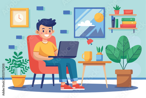 freelancer, laptop, home office, young men, cosy, plant, comfortable, working, cheerful, casual attire, daylight, productivity, creativity, design, workspace, relaxation, sitting, technology, happiness, nature, green plant, home interior, sun, coffee mug, professional, sharpened, contemporary, indoor, leisure, creative, occupational, casual attire, inspiration