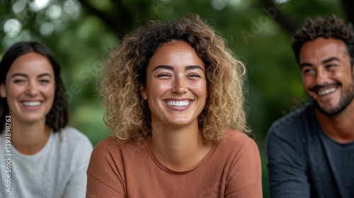 friends, smiling, happiness, connection, joy, nature, casual attire, togetherness, laughter, diverse, group, positive, lifestyle, candid, cheerful, friendship, relaxation, greenery, portrait, fun, oneness, enjoyment, social, warm, light, carefree, harmony, community, engagement
