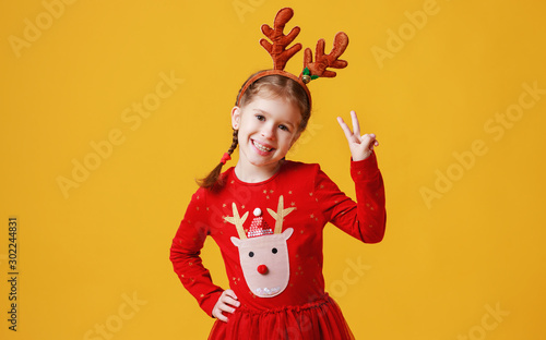 happy funny emotional child girl in red Christmas reindeer costume on yellow background.