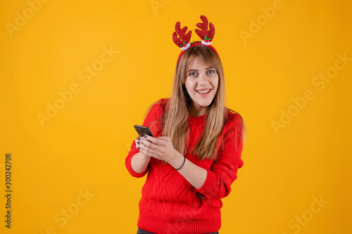 happy girl holding smartphone in hands wearing funny christmas hoop isolated over yellow