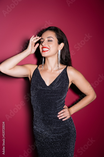 red, shiny, beautiful, happy, smiling, beauty, model, cheerful, caucasian, brunette, black, style, fashion, emotion, pretty, elegant, stylish, glamour, woman, make-up, joyful, trendy, charming, sexy, dress, earring, attractive, sensual, posing, positive, pleased, seductive, lipstick, fashionable, visage, burgundy, carmine, one person, closed eyes, studio shot, young adult