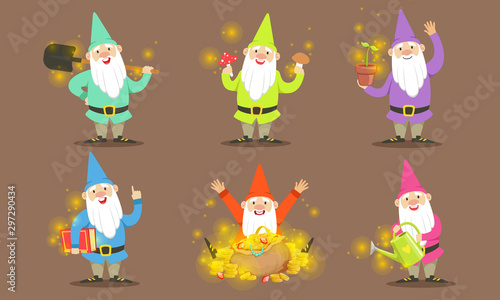 Happy Gnomes Set, Bearded Gnomes Characters with Tools for Getting Gold, Crystals and Precious Stones Vector Illustration