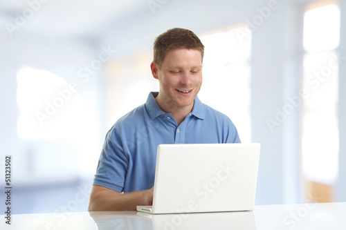laptop, man, computer, home, one person, young adult, smiling, happy, happiness, casual attire, male, typing, sitting, adult, indoor, looking, living room, office, color image, copy space, photo, education, student, classroom