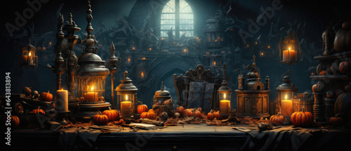 Happy Halloween background spooky scene, creepy dark night jack o lantern pumpkins and spooky graves on graveyard ghosts horror gothic evil cemetery landscape. Mysterious night moonlight backdrop.
