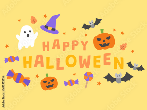 Happy Halloween party banner background featuring cute ghosts, pumpkins, bats, witch hats, and scattered candies on a bright yellow backdrop for a cheerful spooky celebration.