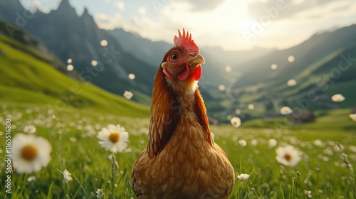 Happy hen in daisy field, mountain backdrop.