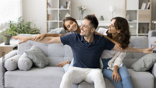 Happy Hispanic parents and little kid spend playful time seated on couch. Family bonding and joyful togetherness, close and supportive connections between parents and daughter, funny leisure at home