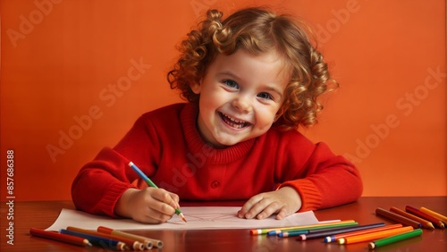 Happy Kindergartener with Crayons: A happy kindergartener drawing with crayons, showcasing creativity.