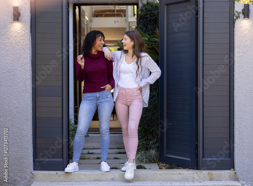 people, happy, lesbian, couple, holding, key, new, home, doorway, homeownership, mortgage, renting, real estate, leisure, lifestyle, love, human relationships, happiness, joy, togetherness, celebration, moving, house, key, entrance, front door, indoor, smiling, hugs, affection, commitment, partnership, domestic life, family, security, investment, property, purchase, home buying, relocation, pride, oneness, bonding, cheerful, residential