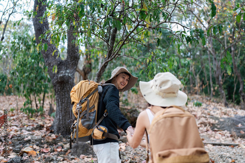 Happy LGBT Lesbian couple Travelers Hiking with Backpacks in forest Trail. LGBT Lesbian Couple Hikers with backpacks walks in mountains in vacation
