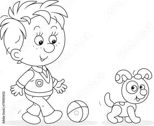 children, children, children, childhood, boy, kindergartner, preschool, schoolboy, childish, puppy, puppy, dog, pet, animal, ball, playing, playful, game, going, go, walking, walk, walker, stroll, strolling, pushchair, promenade, saunter, little, smiling, cheerful, cute, friends, friendship, fun, funny, illustration, cartoon, vector, drawing, black-and-white, colouring