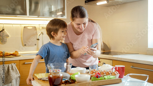 Happy little boy with young mother looking for new recipe to cook on smartphone. Children cooking with parents, little chef, family having time together, domestic kitchen.