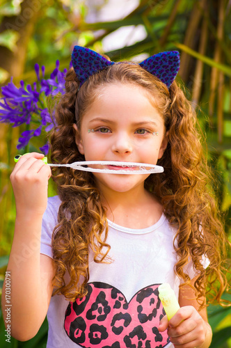 Happy little curly girl playing with soap bubbles on a summer nature, wearing a blue ears of tiger accessories over her head in a blurred nature background