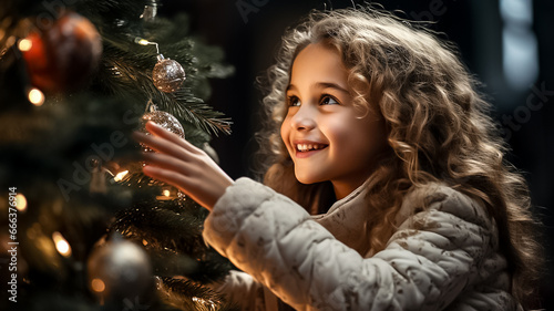 happy little girl decorating christmas tree at home, winter holidays, charity and people concept Merry Christmas Holiday concept