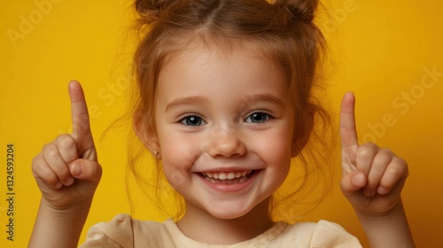 happy, girl, children, children, toddler, finger, up, pointing, cheerful, smiling, cute, adorable, playful, fun, expression, positive, emotion, childhood, innocence, joy, excitement, bright, vibrant, yellow, background, portrait, photo, image, stock, photo, little, person, human, people, happiness, smile, teeth, hair, face, eye, feeling, gesture