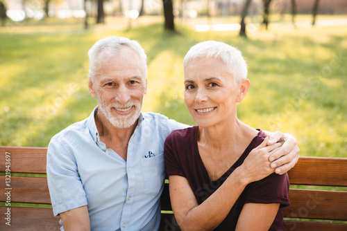 Happy lovely grey haired senior couple sitting on bench in public park talk and smile looking to each others spend time together. Elderly people love relationship concept.