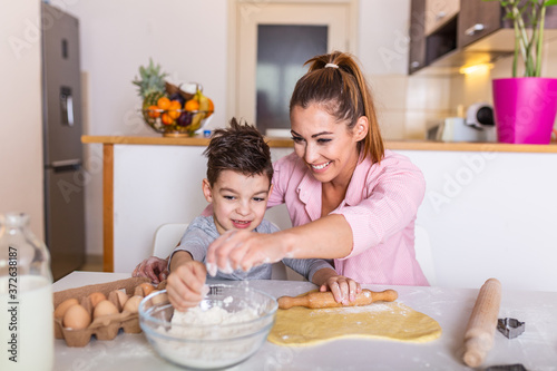 Happy loving family are preparing bakery together. Mother and child son boy are cooking cookies and having fun in the kitchen. Homemade food and little helper.
