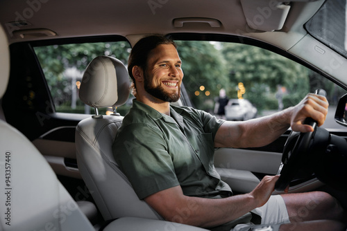 Happy man driving a car with a confident smile in a comfortable interior surrounded by greenery