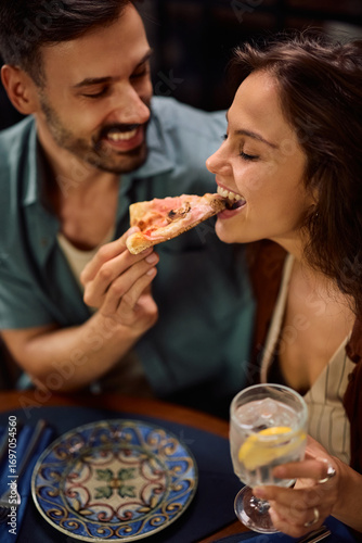 Happy man feeding his girlfriend with pizza during a lunch in pizzeria.