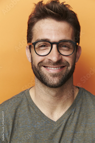 photo, color image, one person, vertical, model, fashion, front view, closeup, indoor, studio shot, beard, stubble field, casual clothes, portrait, eyeglass, photogenic, smiling, cheerful, happiness, confidence, t-shirt, brown eyes, orange background