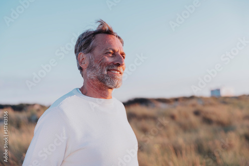 happy, man, standing, sky, happiness, smiling, copy space, 1, people, adult, belgium, outdoors, day, casual attire, nature, escapism, dune, beach, sand, mature, grey hair, caucasian, lifestyle, looking, weekend, beard, male