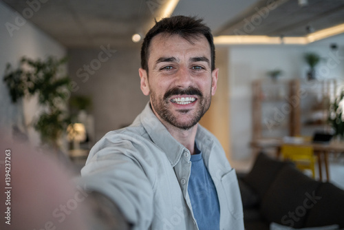 man, selfie, home, smiling, happy, tattoo, arm, beard, moustache, latin, shirt, t-shirt, blue, house, apartment, interior, living room, sofa, table, chair, plant, modern, contemporary, design, lifestyle, technology, mobile phone, smartphone, photo, portrait, cheerful, positive, friendly, confident, casual attire