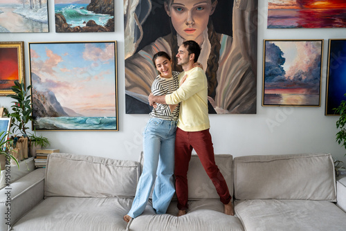 couple, artist, fun, hugging, happy, joyful, married, embracing, home, man, woman, family, husband, wife, positive, love, cheerful, joking, fooling, carefree, smiling, partner, relationship, healthy, female, male, emotion, expression, standing, couch, room, studio, gallery, together, sharing, passion, affection, posing, enjoying, romantic, bonding, comfortable, pleasant, pair, tender, marriage, relaxed, feeling, loving