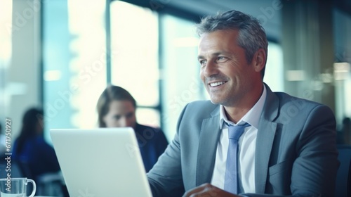 Happy mature business man executive manager looking at laptop computer watching online webinar or having remote virtual meeting, video conference call negotiation.
