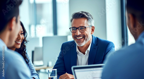 businessman, meeting, happy, mature, laughing, leader, smiling, professional, team, successful, corporate, office, senior, man, business, collaboration, ceo, people, teamwork, discussion, positive, confident, manager, colleague, group, partnership, photogenic, charismatic, friendly, executive, middle-aged, grey hair, goggles, suit, workplace, communication, success, happiness, negotiation, corporate culture, boss, director, conference room, brainstorming, deal, interview, agreements, businessperson