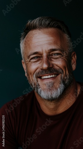 man, mature, adult, male, portrait, face, smiling, happy, joyful, laughing, grey hair, grey hair, beard, goatee, expression, emotion, positive, cheerful, confident, photogenic, attractive, lifestyle, people, person, human, model, head shot, closeup, studio, background, blue background, casual attire, t-shirt, middle-aged