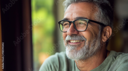 Happy mature man with grey beard and glasses. Ideal for active aging, authentic lifestyle, or senior wellness content.