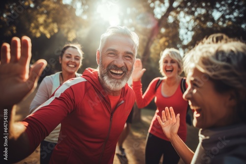 happy, mature, people, high, 5, jogging, running, park, athletic, clothing, path, tree, blurred, face, accomplishment, teamwork, after, finish, 50s, group, team, fitness, health, wellness, friendship, fun, joy, goal, challenge, run, sporty, active, lifestyle, leisure, recreation, hobby, exercise, nature, background, greenery, sunny, bright, cheerful, energetic, positive