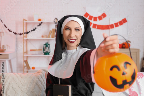 Happy mature woman dressed as nun with Holy Bible and jack-o-lantern sitting on sofa at decorated home. Halloween celebration