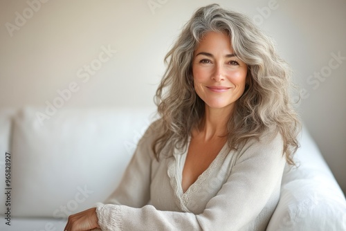 mature, woman, smile, portrait, closeup, beige, outfit, sofa, white, living, room, background, neutral, interior, lifestyle, elegant, relaxed, casual attire, female, fashion, home, furniture, sitting, indoor, modern, bright, comfortable, minimalist, beauty, confidence, serene, joyful, peaceful, happy, stylish, senior, calm, gentle, natural, soft, grace, expression, simplicity, warmth