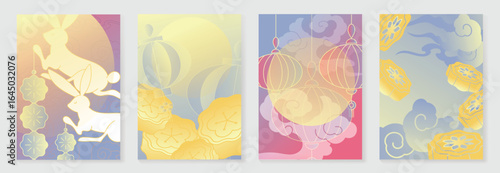 Happy mid autumn festival poster vector set. Wallpaper template with cute rabbit, moon, cloud, flower, moon cake on red blue gradient background. Illustration design for cover, banner, card, ads.