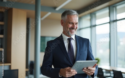 Happy middle aged business man ceo wearing suit standing in office using digital tablet. Smiling mature businessman professional executive manager looking away thinking working on tech device.