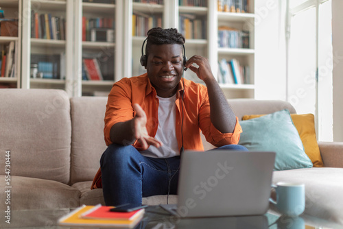 african american, male, young, man, laptop, headset, e-learning, education, remote, casual attire, freelancer, online, adult, cyberspace, technology, home, work, computer, black, indoor, modern, website, guy, freelance, using, distance, sofa, career, student, lifestyle, couch, people, chubby, overweight, fat, fats, living room, entertainment, school, course, application, communication, studying, learning, lecture