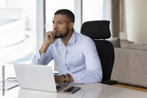 Happy millennial African freelance businessman looking away from office workplace, sitting at laptop computer on work table, thinking over project future vision, task completion