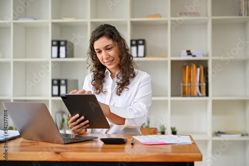 Happy millennial Caucasian businesswoman using a digital tablet at her desk
