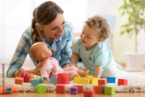 happy mom with lbaby son playing doll on floor
