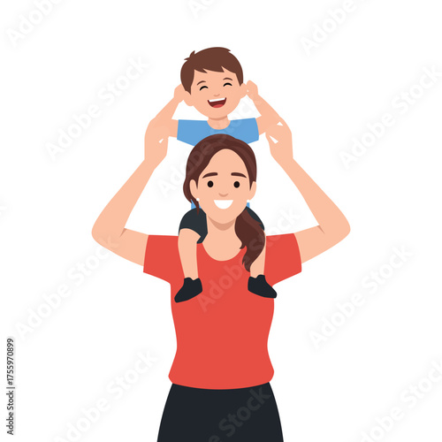 Happy Mother Carrying Son on Shoulders. Flat vector illustration isolated on white background