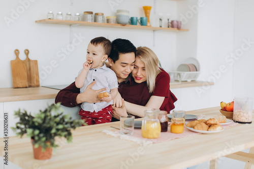 Happy multicultural family. Asian dad and his caucasian blonde wife have breakfast with their beautiful son in the kitchen.